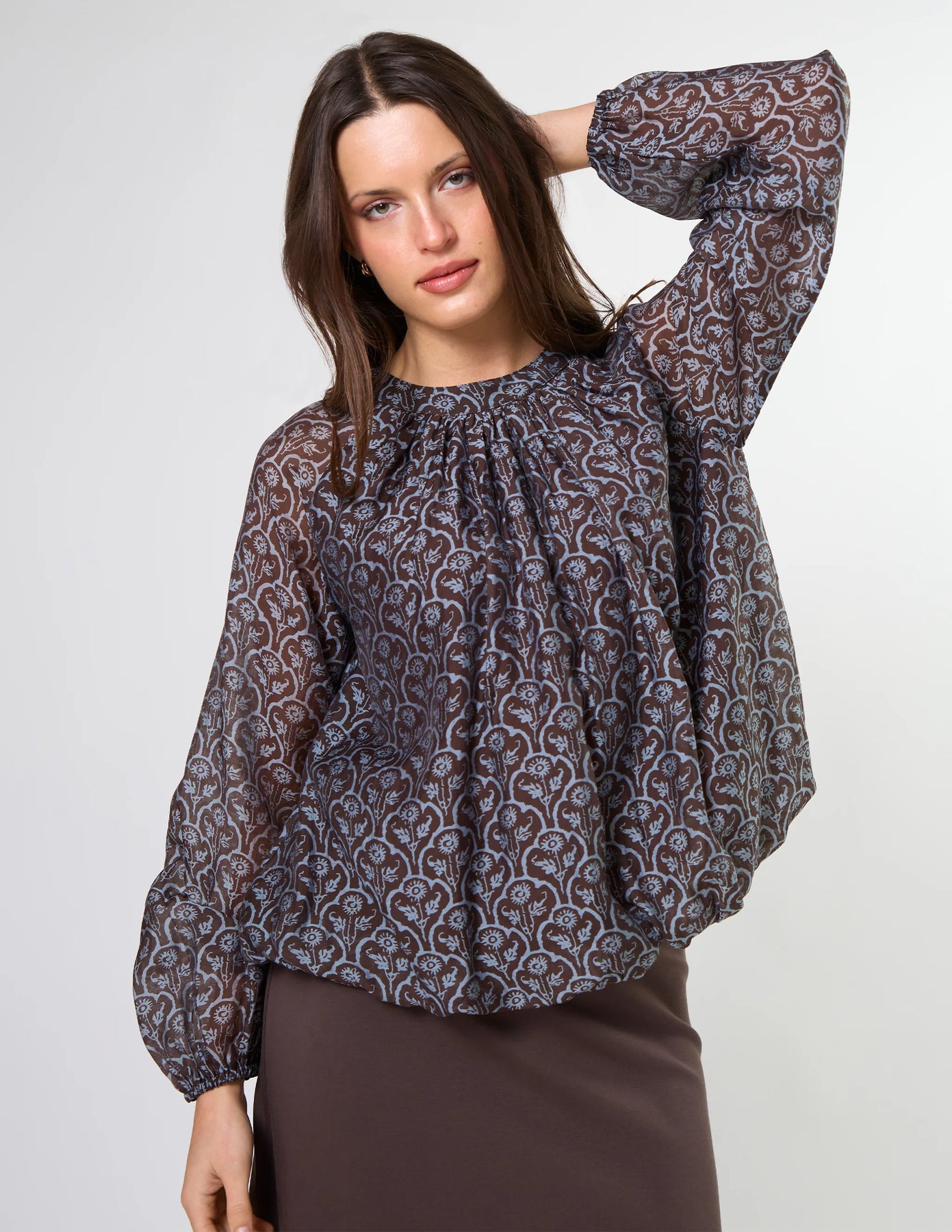 Crew neck blouse with full raglan sleeves gathered into cuffs. The hemline is turned under into a bubble hem and lined bodice.