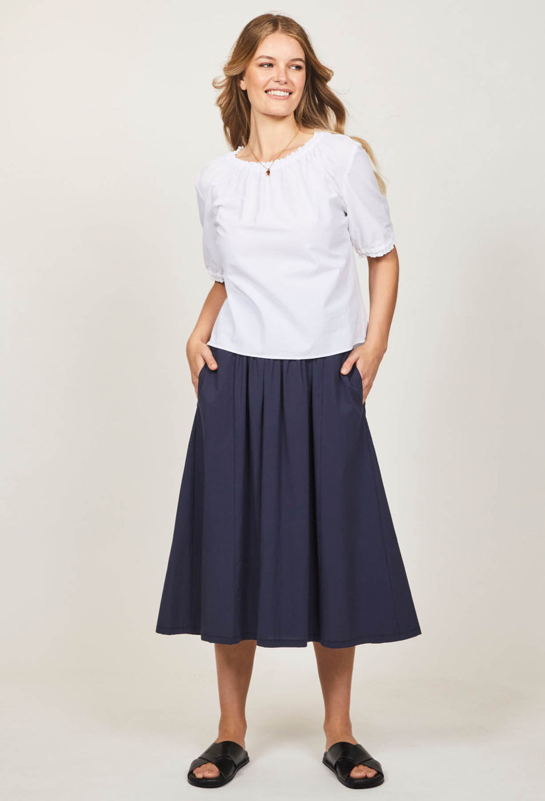 A new summer silhouette available in an array of colours. Ruffle neck blouse with relaxed body and short set in sleeve finished with slight ruffle feature. The shorter length is ideal for wearing over skirts or pants.