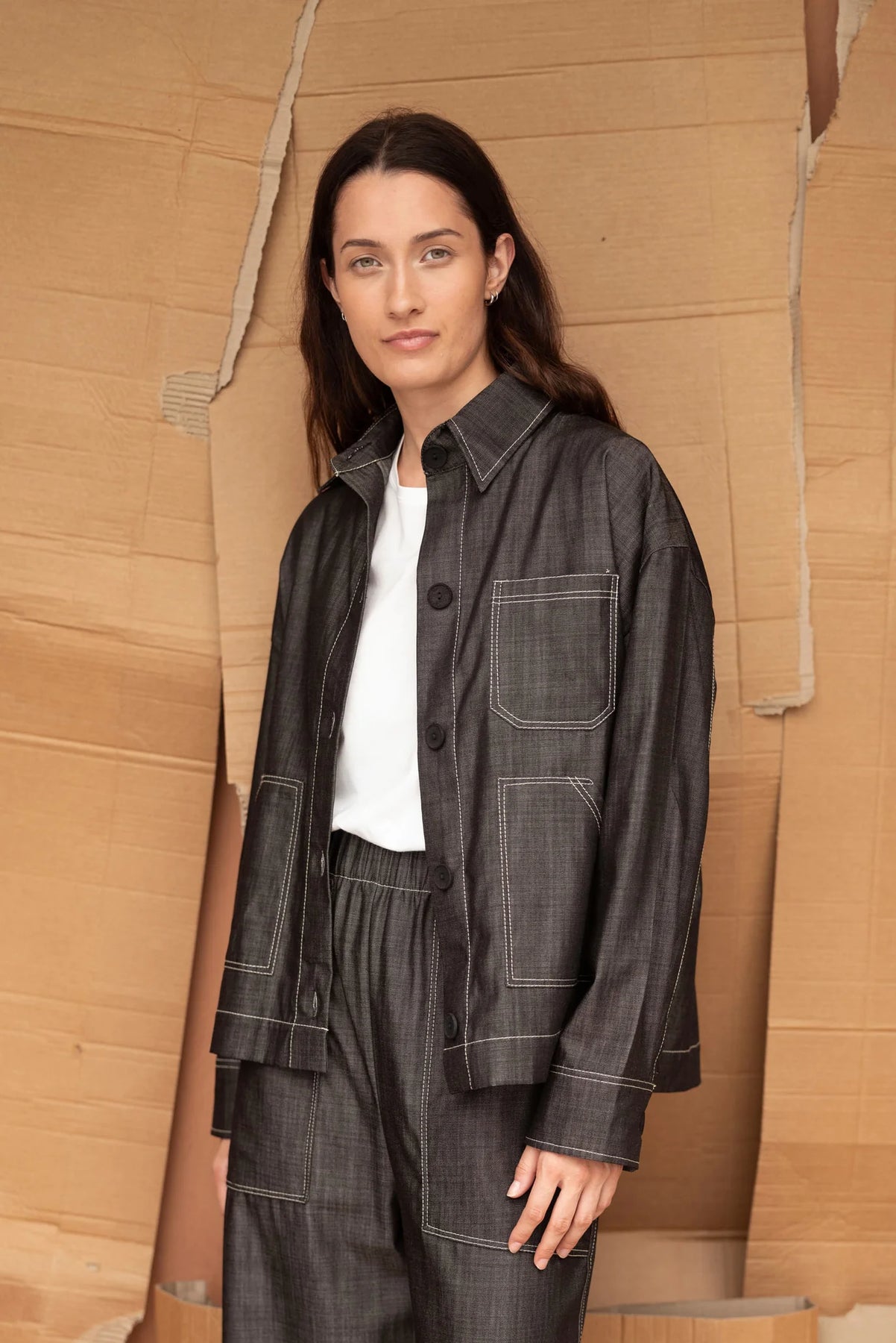 Featuring a relaxed cut with detailed rear pleat, classic collars and cuffs, patch pockets, and a front closure with recycled cotton buttons.