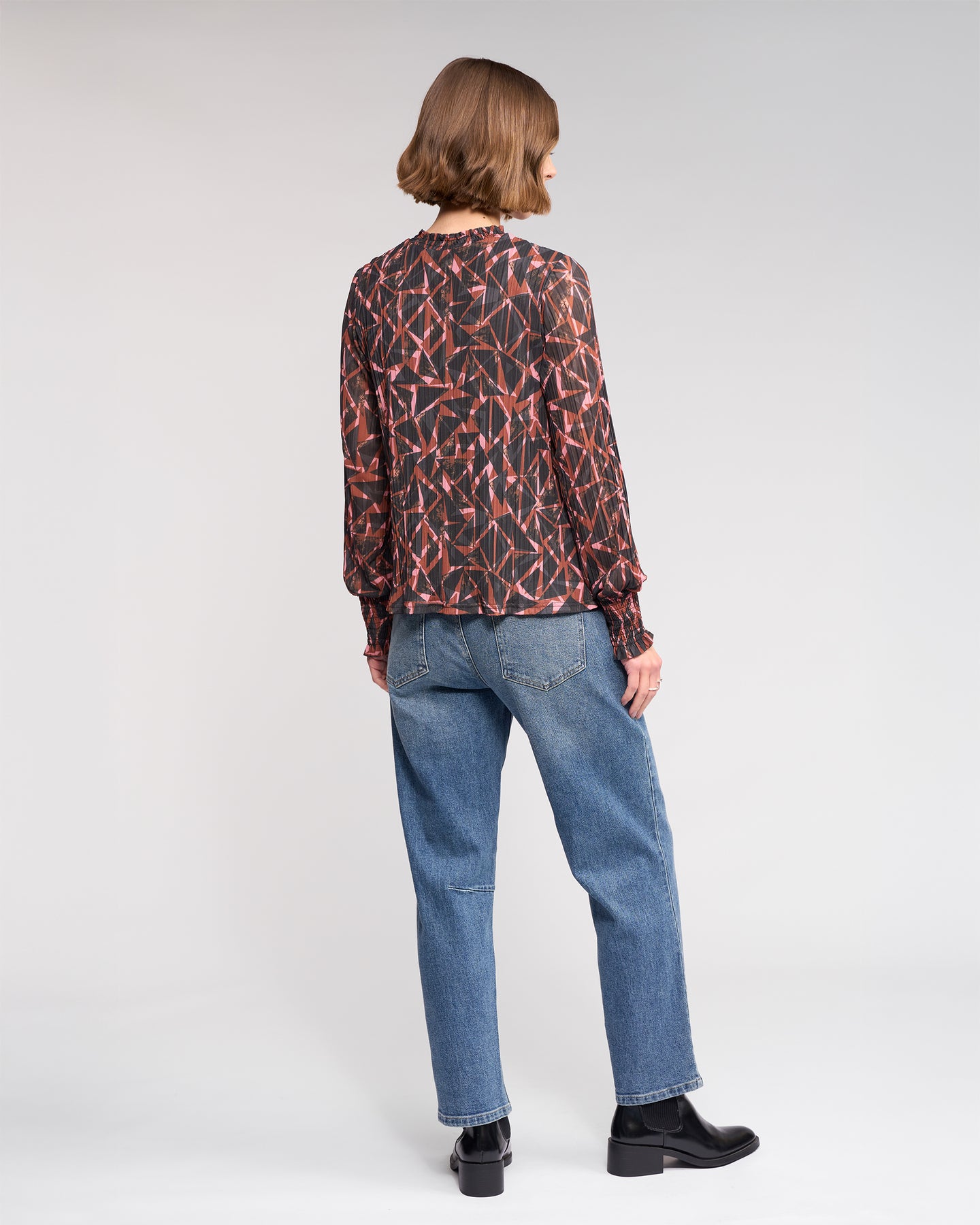 Long sleeve mesh top in the Dusk print, a bronze coloured base with black and light pink geometric shapes. Made from stretchy crinkle fabric with a lined body for coverage. Featuring a shirred high neck and long sleeves that gather into ruffled cuffs.