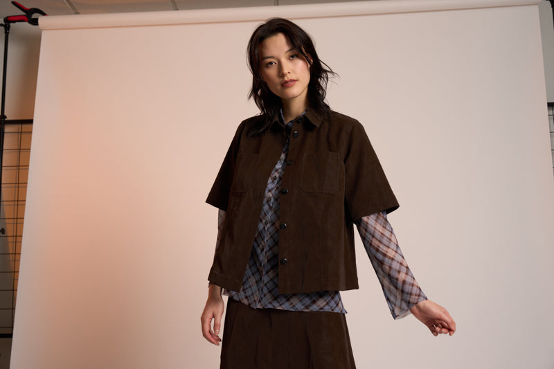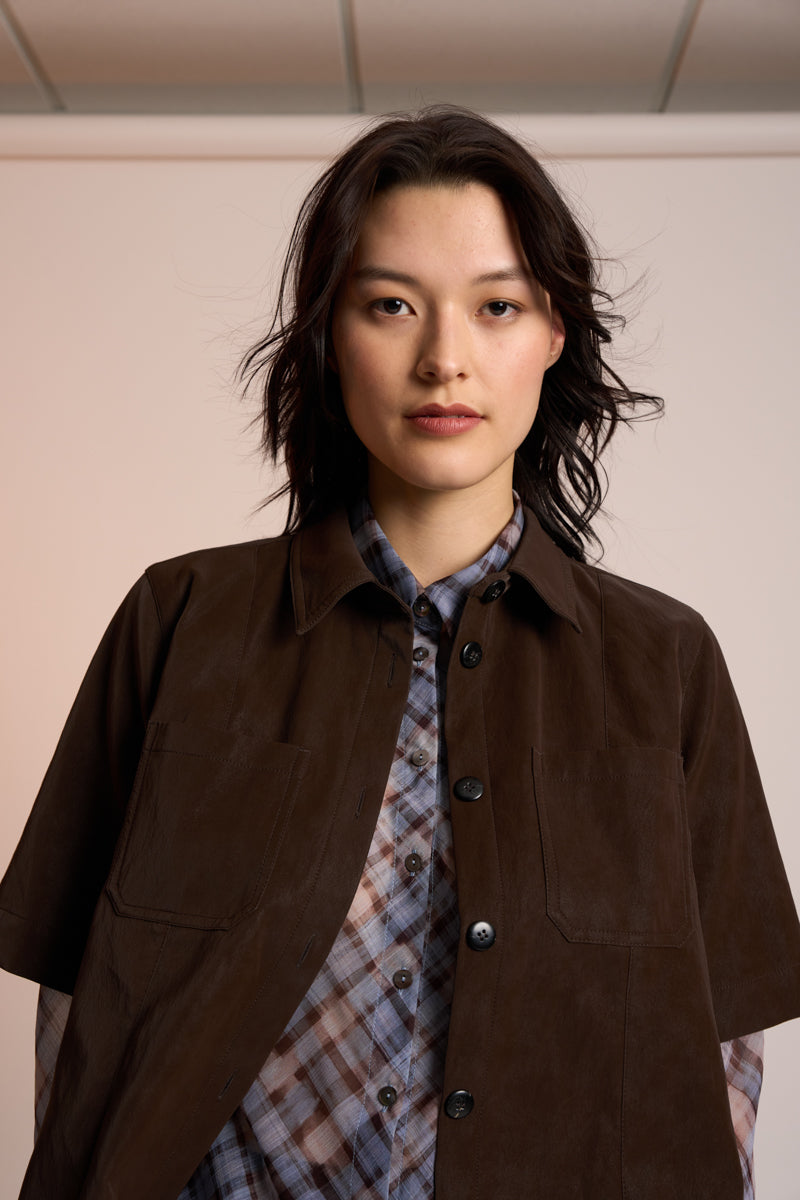 The Dylan Shacket by Neris is a modern, stylish layering piece crafted from ultra-soft, chocolatetoned faux suede with a gentle stretch for added comfort. This short-sleeve shirt-jacket silhouette offers versatility — wear it buttoned on its own for a clean, contemporary look, or layer it over a light shirt or mesh top for added texture and dimension. A refined essential that brings warmth, softness, and effortless cool to your wardrobe. OUTER - 100% POLYURETHANE BASE - 79% VISCOSE 16% POLYESTER 5% METALLIC