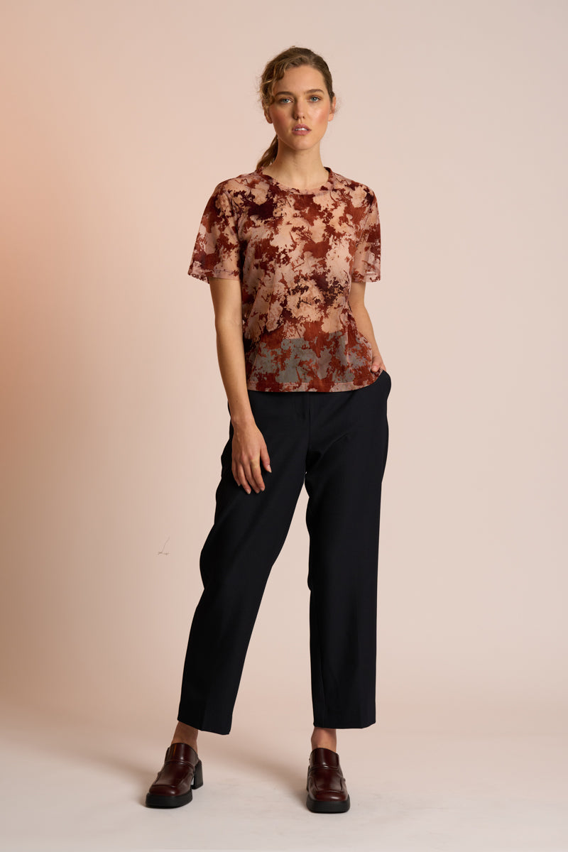 The Sequoia Top by Neris is a statement layering piece crafted from flocked mesh in a rich burntorange hue. This short-sleeved tee features a classic crew neckline, short sleeves and is a sheer design, perfect for layering under pinafores or over camisoles and long-sleeve tops. Add texture and colour to your outfit and have fun experimenting with this playful, versatile piece. 100% POLYESTER