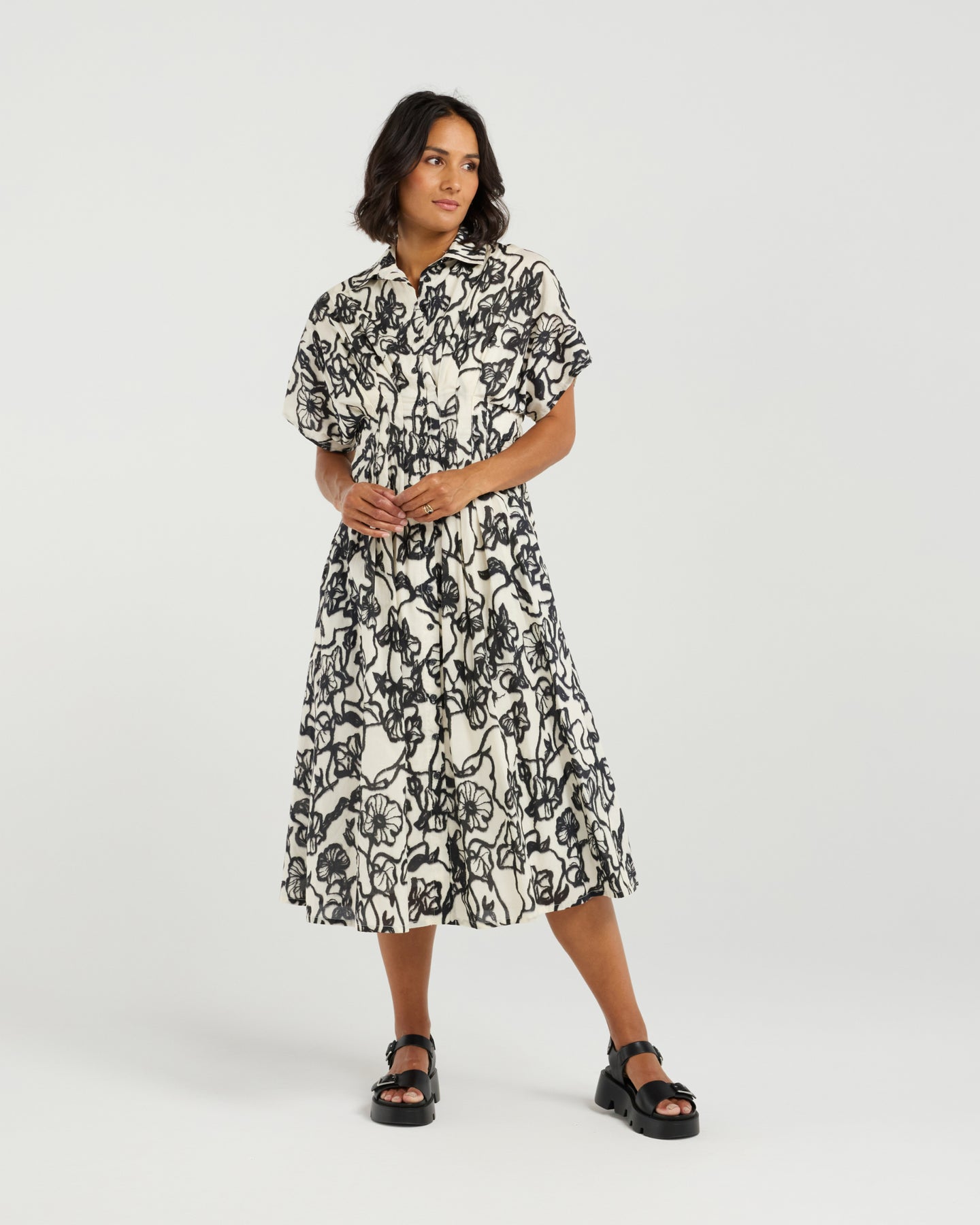 Audrey is an effortlessly chic mid-length dress featuring a classic collared neckline and short sleeves, combining timeless style with everyday ease. The button-down front adds a touch of tailored charm, while delicate pleating at the waist creates a flattering, nipped-in silhouette. Perfect for both casual outings and polished occasions, this dress is a versatile staple for any wardrobe.