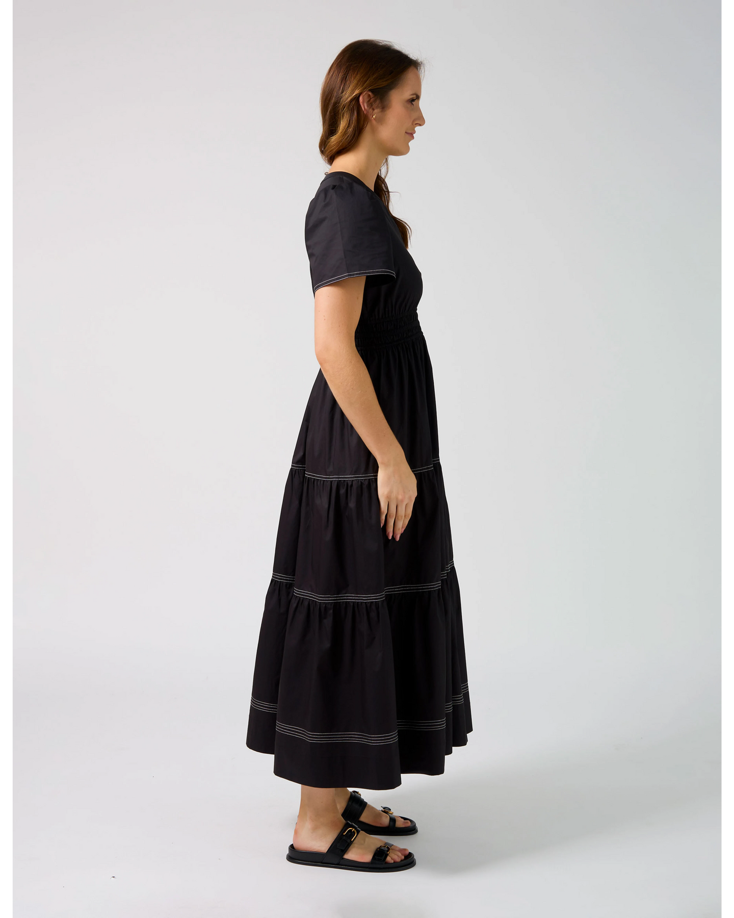 • V neck tiered maxi dress with fitted upper bodice , puffed sleeves and elasticated waist