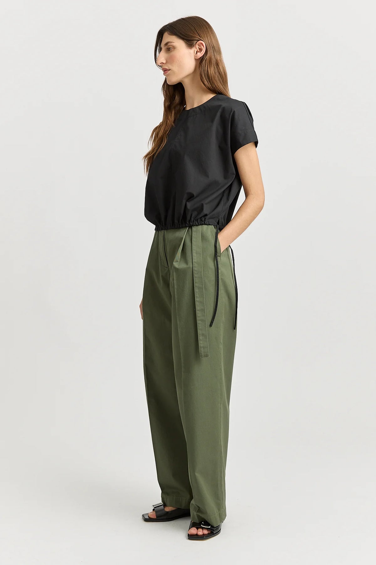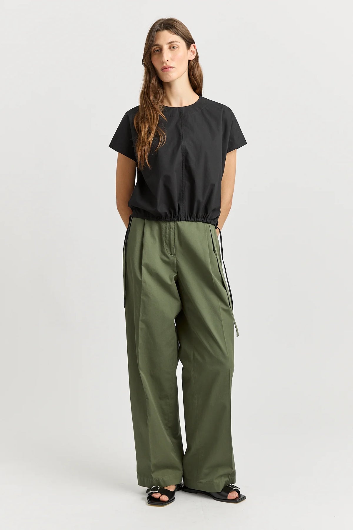 The Cotton Drawstring Top is a versatile style cut from a crisp Cotton Poplin. The boxy silhouette can be pulled in at the waist to create soft gathers.