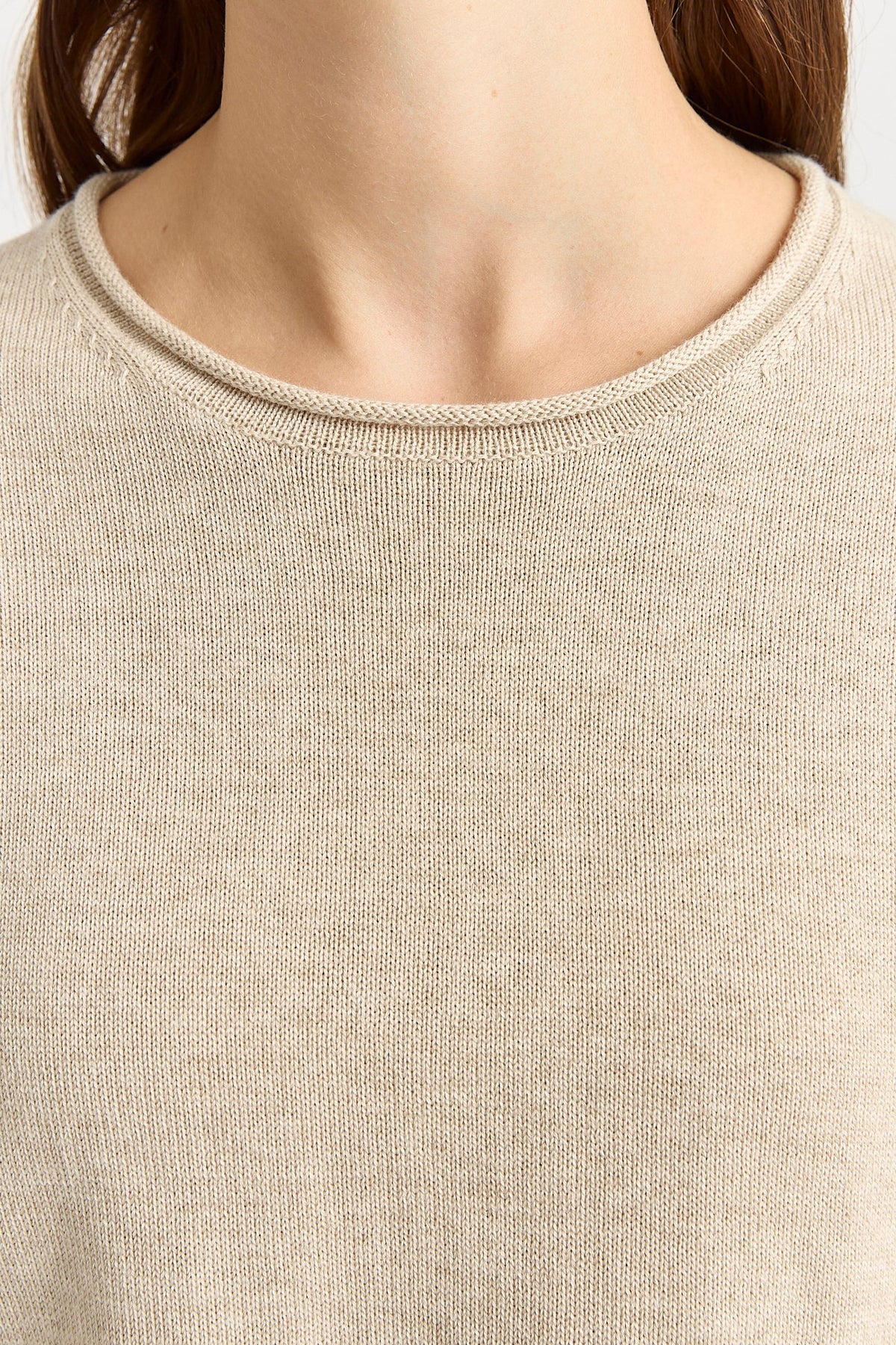 The Short Sleeve Knit has a relaxed silhouette with a round neck accented by a soft roll trim. The elbow-length sleeves are slightly rounded and detailed with a fine rib trim.
