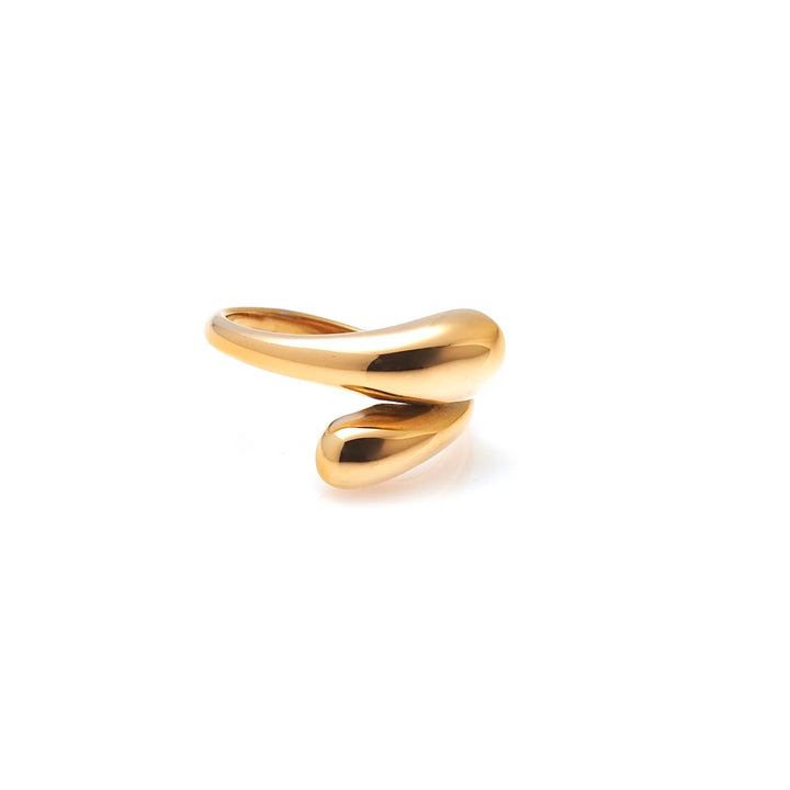The Aura Ring features an organic, fluid shape with a wrap design and rounded ends of varying sizes. Worn alone for minimalist style or stacked for added impact, this timeless piece is crafted from durable, hypoallergenic stainless steel with a luxurious gold plating, designed to last.