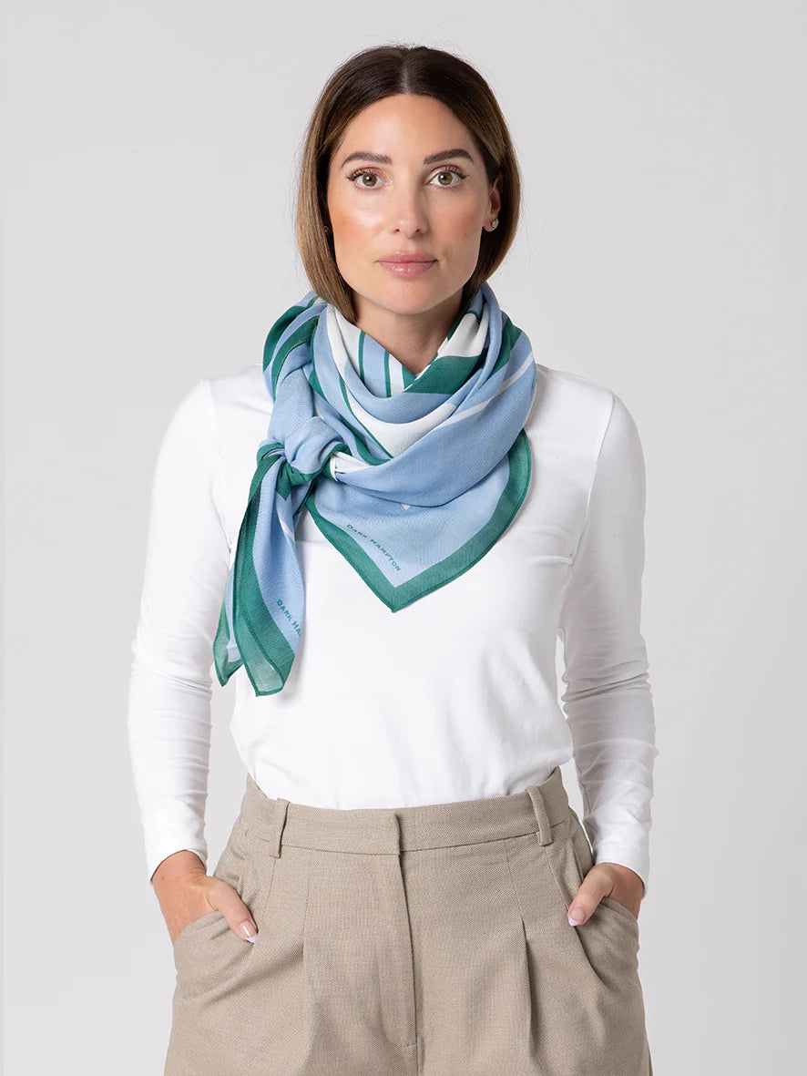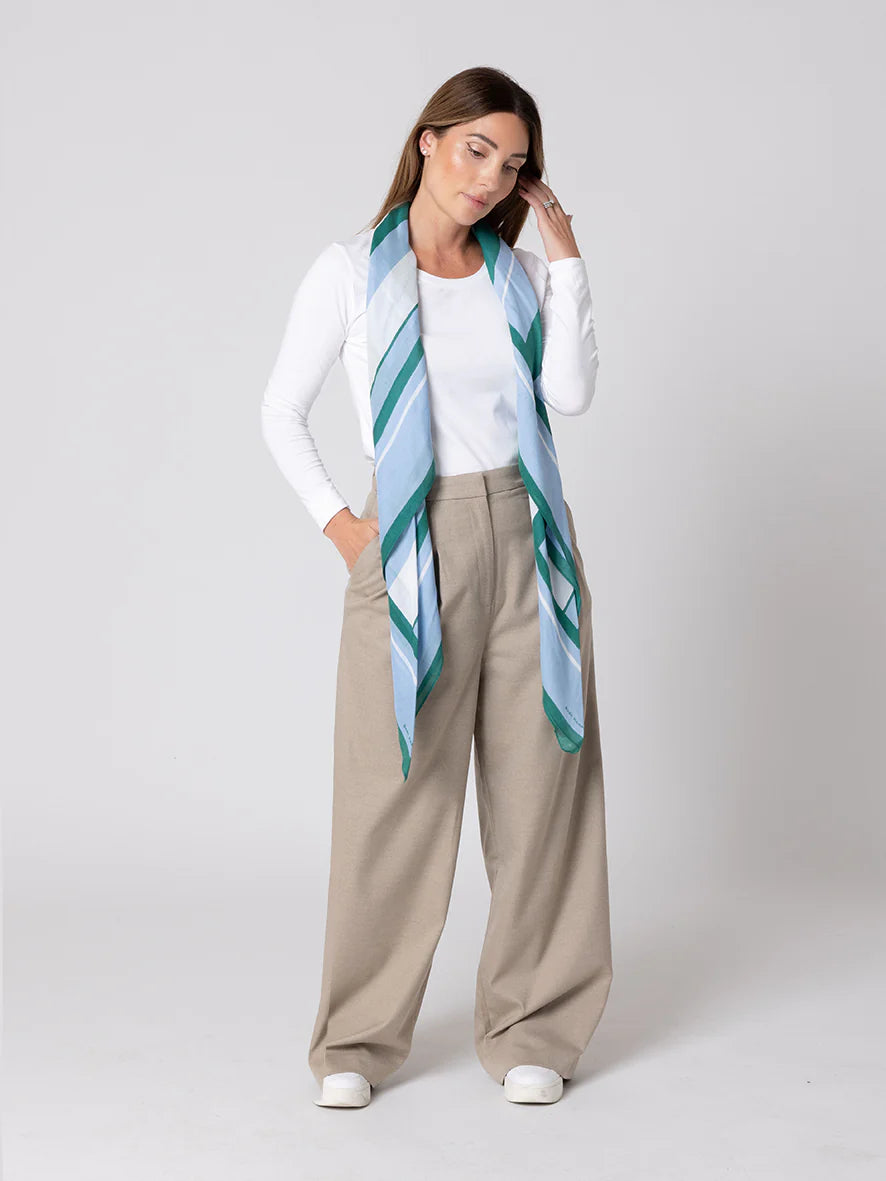 Featuring bold geometric stripes in shades of blue, green and white. It's the perfect statement piece for any season.